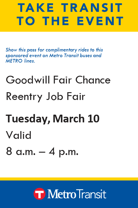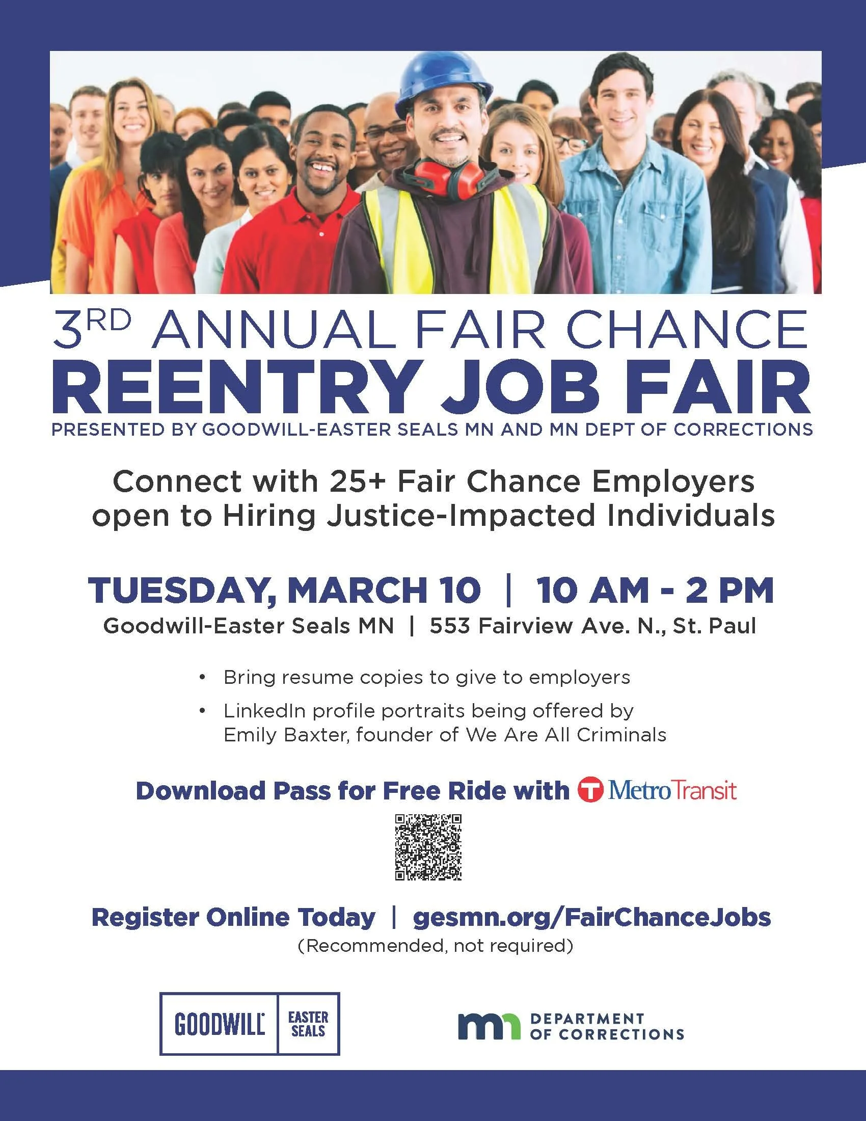 3rd Annual Fair Chance Reentry Job Fair Tuesday, March 10, 2026 10:00 AM 2:00 PM 10:00 14:00 Goodwill-Easter Seals MN 553 Fairview Avenue North Saint Paul, MN, 55104 United States (map) Google Calendar ICS To Register Online (Recommended, not required)gesmn.org/FairChanceJobs